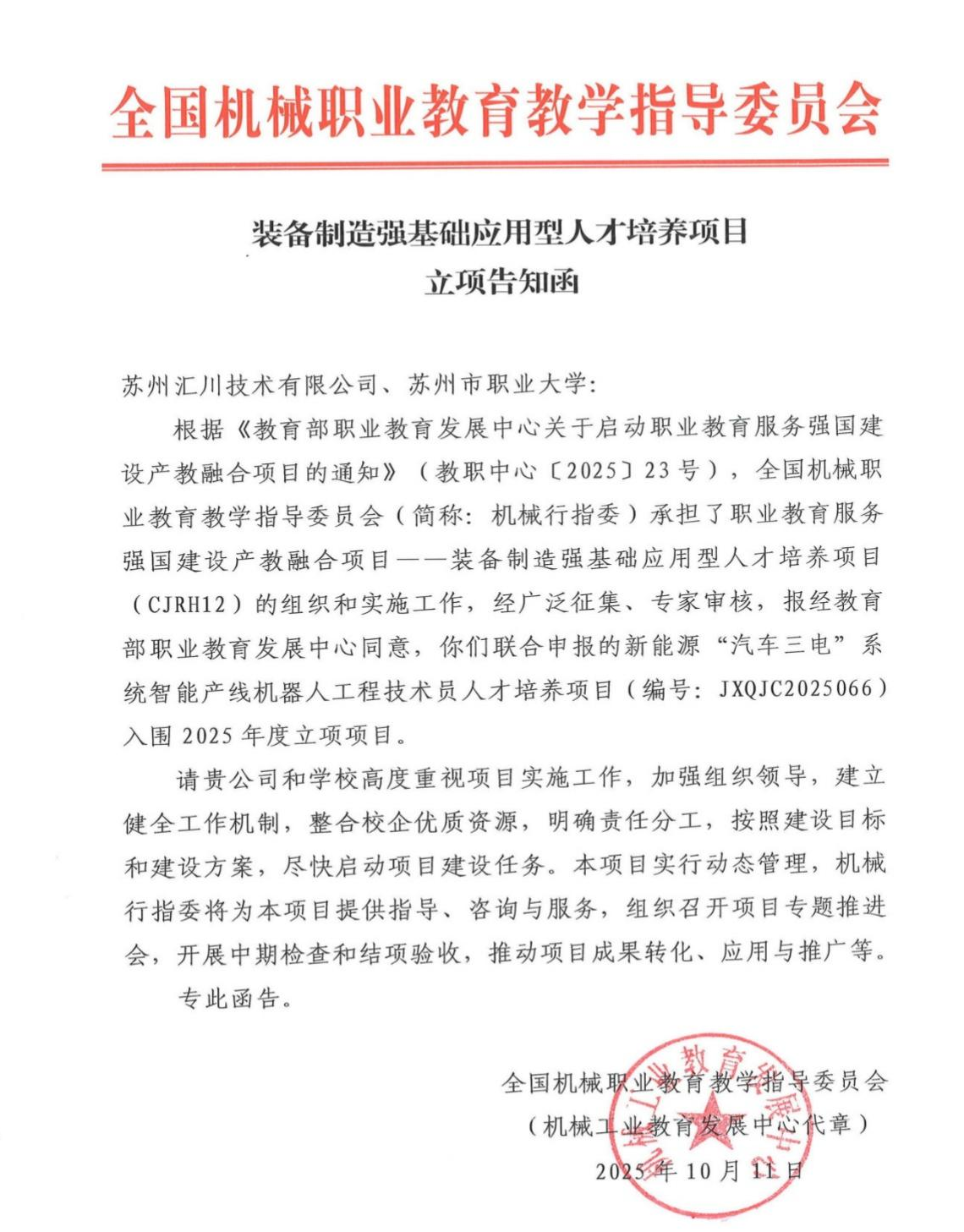 近日,全国机械职业教育教学指导委员会发布“装备制造强基础应用型人才培养项目立项告知函”,我校与苏州汇川技术有限公司共同申报的“新能源‘汽车三电’系统智能产线机器人工程技术员人才培养项目”在全国同类校企竞争中脱颖而出,成为首批入选的80个项目之一。