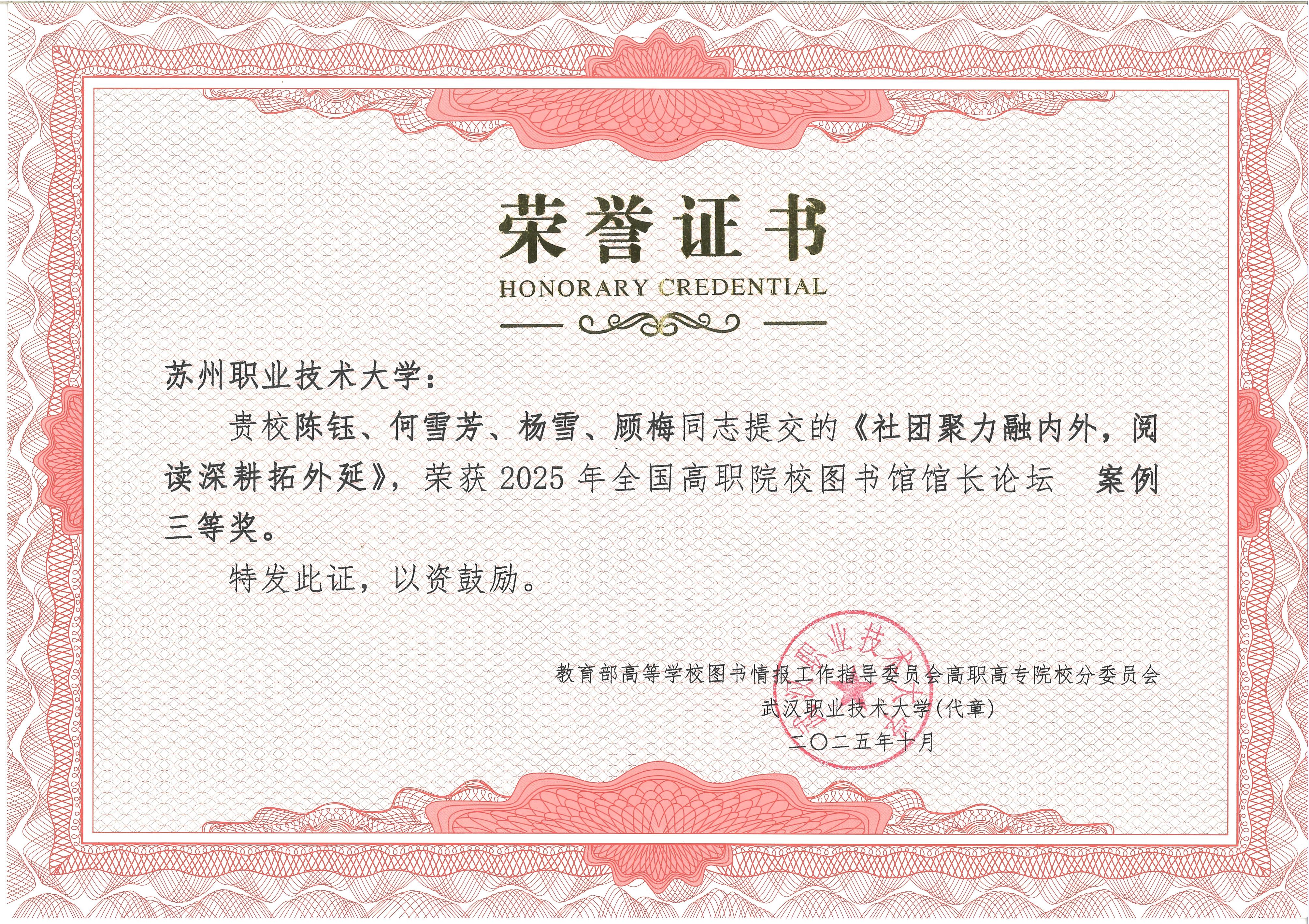近日,在贵阳交通职业技术大学举办的2025年全国高职院校图书馆馆长论坛上,我校图书馆报送的两项服务案例双双荣获三等奖,成为本届论坛中少数两所实现多项案例同时获奖的高校之一。本次论坛由教育部高等学校图书情报工作指导委员会高职高专院校分委员会主办,此次获奖充分体现了我校在高职院校图书馆服务创新领域的扎实探索与显著成效。